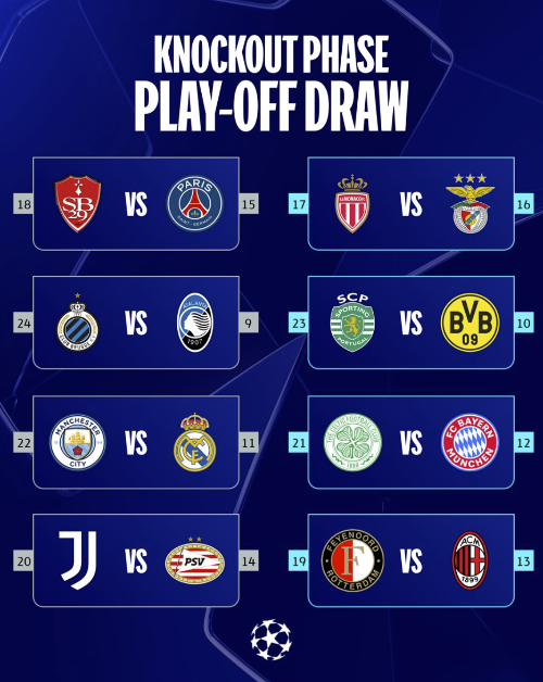 2024-25 UEFA 챔피언스리그 16강 플레이오프 대진 추첨 결과는 다음과 같습니다.